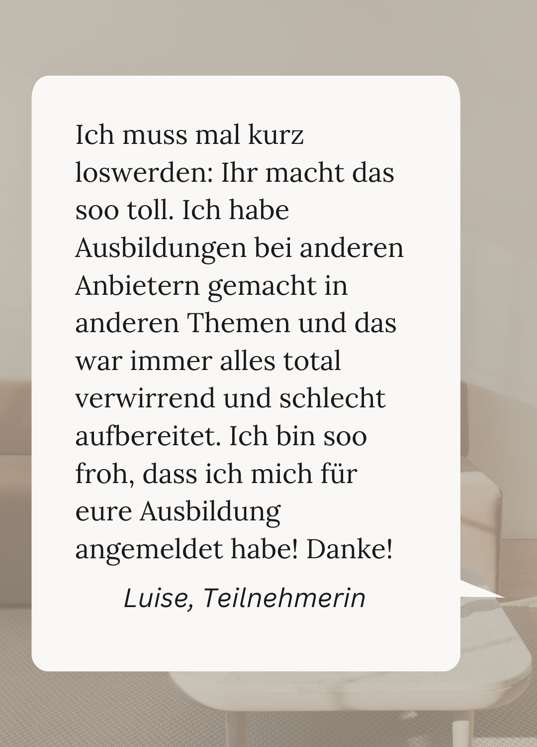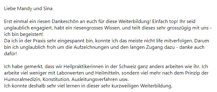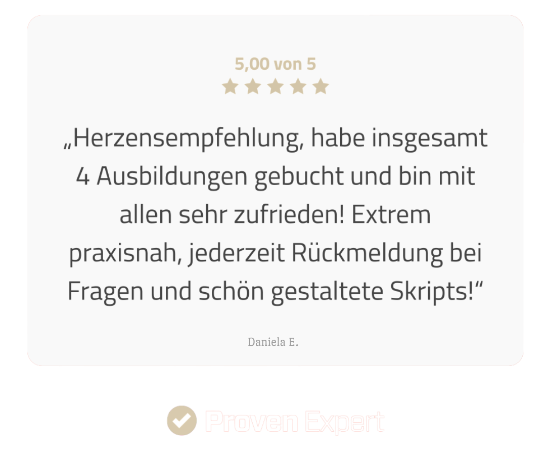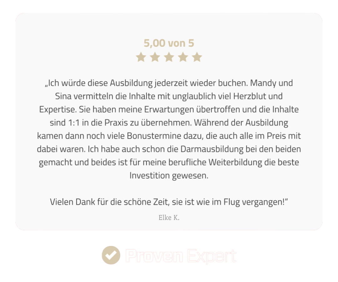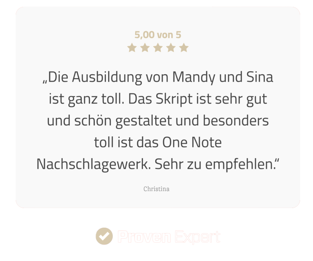 Ich kann die Ausbildung bei Mandy & Sina zu 100 empfehlen! Die Inhalte sind top strukturiert und aufgebaut, es gibt ein umfangreiches Skript, alles wird ausführlich & sehr verständlich vermittelt und der Austausch in der Gruppe ist auch noch über die Ausbildungszeit hinaus eine wertvolle Unterstützung für die Praxis!