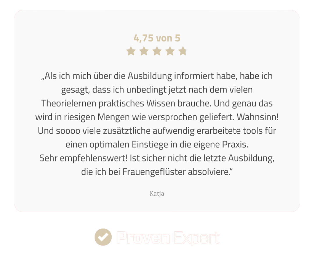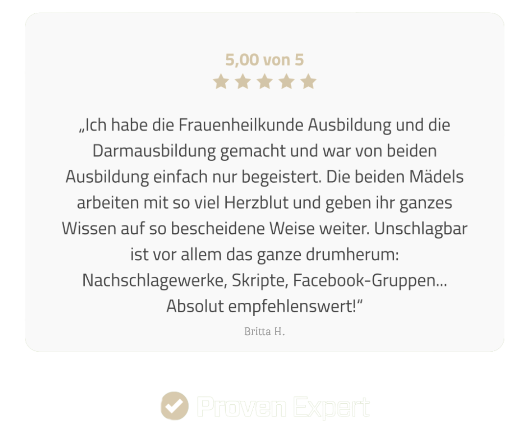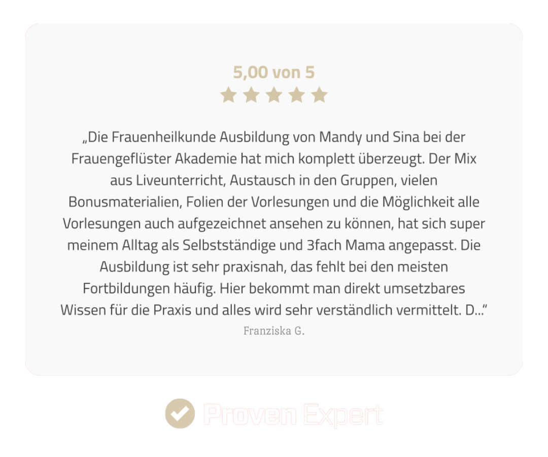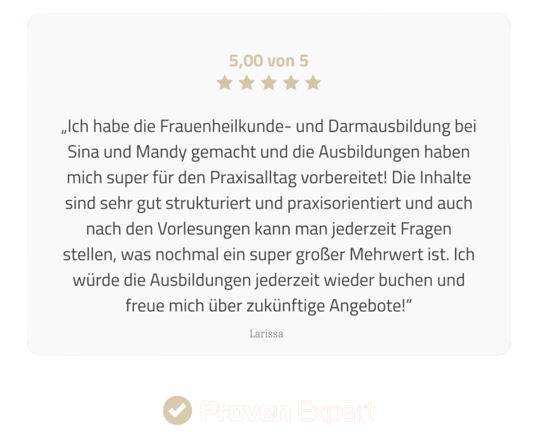 Das was Sina und Mandy hier an Wissen weitergeben und womit sie uns in der Frauenheilkunde Ausbildung bereichern, das kann man kaum im Worte fassen - einfach genial. Der Kurs ist so toll aufgebaut, die Practice Module geben Sicherheit und vertiefen das eigene Wissen und man hat das Gefühl wirklich durchstarten zu können. Ganz zu schweigen von den vielen Bonusmaterialien und Aufzeichnungen etc. - DANKE EUCH und DANKE für die Betreuung, das ist gold wert!